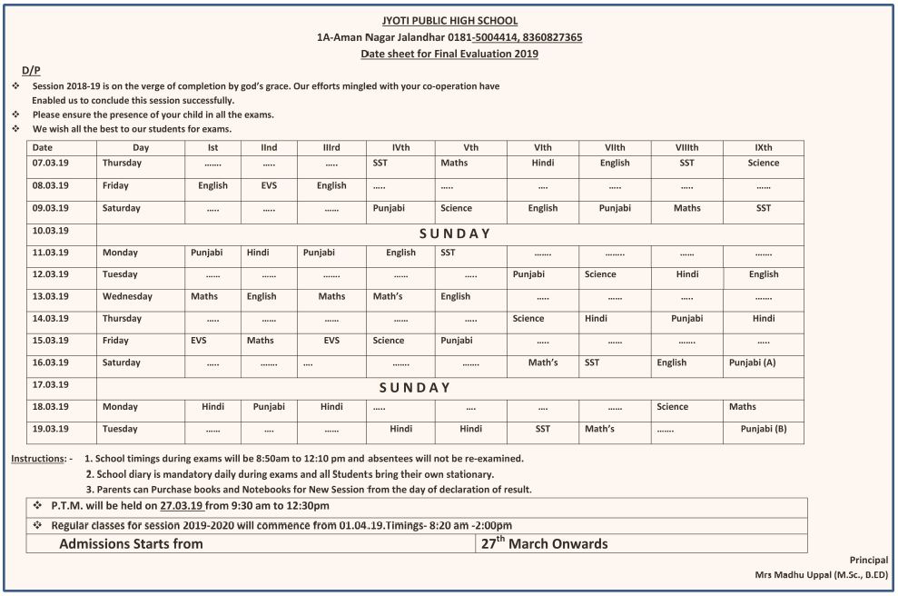 Final Evaluation-2019 DAtesheet 1st to 9th Classes